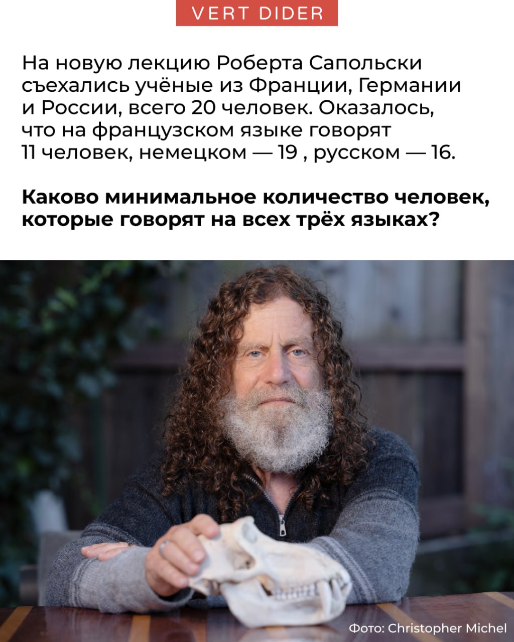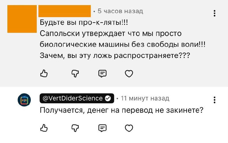 ###**Вау! Сбор на первую лекцию закрылся всего чуть больше, чем за день! Вы очень крутые, спасибо за поддержку!****🎉** Первую лекцию уже делаем. Постараемся оперативно. Пока запускаем сбор на вторую лекцию. А для тех, кто пропустил, напоминаем, что Роберт Сапольски выпустил переиздание курса «Биология поведения человека»: новые лекции с обновлёнными данными. Мы хотим подготовить перевод и для этого нам нужна ваша помощь. Открываем сбор на перевод и озвучку второй лекции: Лекция #2: Эволюция поведения, 1 Хрон: 79 мин Цель: 150 000 рублей⬇️ Собрано: 34 458 рублей ➡️Поддержать выход лекции: https://www.tbank.ru/cf/9Qc6ALzgO4k ➡️https://messenger.online.sberbank.ru/sl/9xSx0UpVohPHL01nM Также вы можете поддержать нас другими способами: Telegram: https://t.me/tribute/app?startapp=s2hR Patreon: https://www.patreon.com/VertDider Boosty: https://boosty.to/vertdider **В сумму входят:** 1. Перевод видео; 2. Редактура перевода; 3. Научная редактура перевода; 4. Озвучка (с учётом нескольких итераций внесения правок); 5. Монтаж звука (с учётом нескольких итераций внесения правок); 6. Монтаж звука с видео (с учётом нескольких итераций внесения правок); 7. Отслушка на предмет ошибок (3 человека) с учётом нескольких итераций внесения правок. #сбор@vertdider