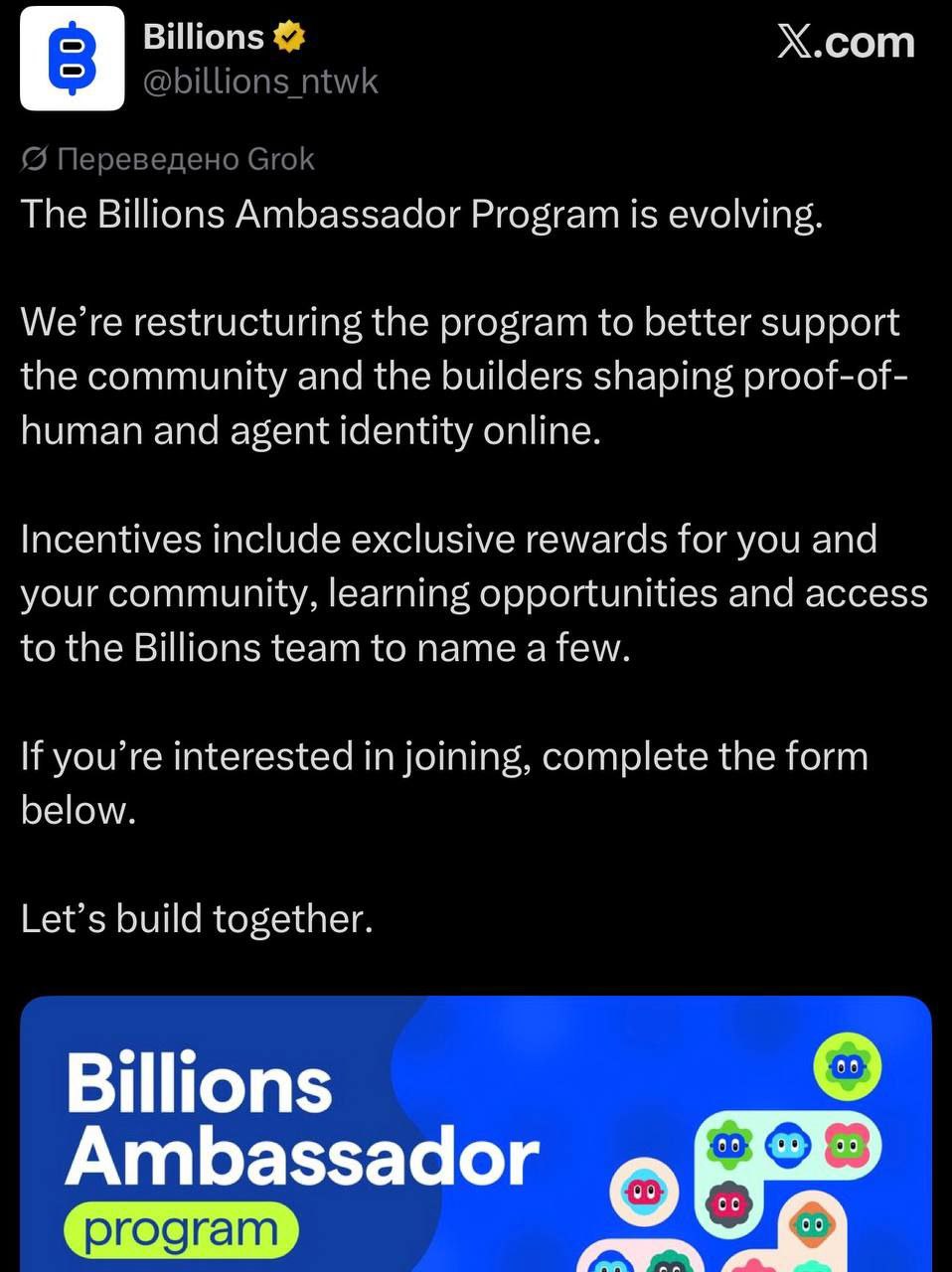 ###🤔 **Billions - появилась **форма для подачи на амбу Проект Billions Network продолжает развивать свою систему активностей. Ранее многие фармили поинты через дейлики, но теперь команда выпустила AMBA-форму, которую [анонсировали](https://x.com/billions_ntwk/status/2029964226396033438?s=46&t=esB9lOws_k2k2qDJQs2CWw) буквально несколько часов назад. **❓**** Что произошло:** 🟢Ранее основной активностью был фарм очков в daily-квестах. 🟢Сейчас команда опубликовала [AMBA-форму](https://docs.google.com/forms/d/e/1FAIpQLScOrN-syYL4QSgrp4KZmu65aViAQKAl5Cx1fo5DMCwaBQMBAA/viewform) для участников проекта. 🟢По словам разработчиков, за участие обещают эксклюзивные награды. Пока что это не долгожданный дроп, которого ждёт комьюнити, но возможно это подготовительный этап перед распределением наград. [Proxy-Seller](https://proxy-seller.com/ua/?partner=KQ732SMHSNKDR0) - с промокодом MUTIM - 15% скидки на IPv4, IPv6, ISP, 39% на Резидентские и 10% на Мобильные прокси ℹ️ [**Актуальные проекты на отработку**](https://t.me/investhai5/3301) ℹ️ Мутим на крипте | [Чат](https://t.me/+xJ1J7HLZLBI4MjQy) | [Youtube](https://www.youtube.com/@mutim_na_crypte) | [Teletype](https://teletype.in/@kappaclout) | [Trustee](https://trusteeglobal.com/ru/?r=TDVOMP4IgEb) | [BingX](https://bingx.com/partner/MutimNaCrypte/1i37yr) |
