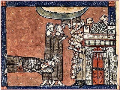 ###Апокалипсис. Англия, XIV в. Paris. Bibliothèque de l'Arsenal. Ms-5214. Fol. 15v. В одном английском Апокалипсисе XIV в. мы видим странную сцену: слева в воздухе, прижавшись ногами к рамке, висят два человека, которых пожирает какой-то монстр в короне. Правее они же стоят, обратив взоры на рушащийся город, а сверху они возносятся на небеса. Вернее, их тела уже скрылись в облаке, и в кадре остались только полы одежд и босые ступни [3]. Это два «свидетеля», которые, как сказано в 11-й главе Откровения Иоанна Богослова, в конце времен будут в течение 1260 дней проповедовать, облачившись во вретища. В средневековой традиции их чаще всего отождествляли с пророками Илией и Енохом, которые выступят против Антихриста. «И когда кончат они свидетельство свое, зверь, выходящий из бездны [т. е. сам Антихрист], сразится с ними, и победит их, и убьет их, и трупы их оставит на улице великого города, который духовно называется Содом и Египет, где и Господь наш распят». Но три с половиной дня спустя в них войдет «дух жизни от Бога», они восстанут и, по повелению небесного гласа «взойдите сюда», в облаке вознесутся на небо. И тогда случится «великое землетрясение», и десятая часть города рухнет. На миниатюре вся эта череда событий показана в одном кадре. Потому фигуры убитых, воскресших и возносящихся «свидетелей» повторяются трижды. Время сгущается в симультанную композицию (в англоязычной литературе такой прием часто называют continuous narration). Здесь фон, на котором разворачивается действо, выглядит предельно условно, а фигуры странным образом пересекаются в воздухе. Даже если не знать о существовании подобных примеров, зритель вряд ли решит, что на миниатюре изображены три пары летающих близнецов. Однако бывают симультанные образы, которые выглядят намного естественней. И потому современному зрителю, который привык к классической живописи, стремящейся соблюсти единство пространства и времени, прочитать их уже не так просто. На одной алтарной панели из Каталонии мы видим Августина Блаженного (354–430), который сидит за книгой в своей келье-«кабинете». Сцена, открывающаяся за окном, — это не вид, который он мог бы увидеть, если бы повернул голову, а один из эпизодов его жития, где он сам же и действует. Однажды во время прогулки он размышлял о Троице и увидел ангела в облике младенца, который ложкой вычерпывал воду из моря в ямку, проделанную в песке. На вопрос, что он делает, тот отвечал, что попытки постичь человеческим разумом природу триединого божества столь же бесплодны, как и это занятие. На алтарной панели фигура св. Августина повторяется дважды (в келье и вдали), а вид из окна оказывается условным приемом, который позволяет включить в основную сцену дополнительный эпизод-комментарий. Таких принципов, которые чрезвычайно важны для понимания средневековых изображений, можно вспомнить немало. В сборнике житий, созданном в Париже во второй четверти XIII в., в одном из инициалов изображен город, а в нем толпа черноликих людей в островерхих шапках. Из-за стен к ним обращается бородатый святой, который изображен выше, чем крепостная башня. Это св. Христофор — по средневековому преданию, он был родом из расы гигантов. Примерно в то же время в Южной Италии, во владениях Фридриха II Гогенштауфена, был создан литургический свиток (Exultet). В нем есть изображение юного императора, который восседает на пре