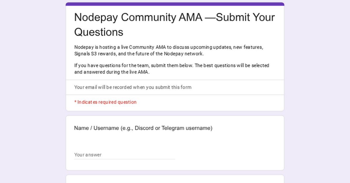 ###We know you’ve been watching closely 👀 The devs have been cooking behind the scenes, and we’re almost ready to reveal what’s next. A sneak peek is dropping very soon 😎 — introducing a new feature where users will be able to predict outcomes using NC / USDT / USDC / SOL. But before that… we want to hear from the Nodes. **🎤 Community AMA Incoming** We’ll be hosting a live AMA soon where the team will answer your questions about what’s coming next for Nodepay. Got something you’ve been wanting to ask? Now’s your chance. **Submit your questions here:** https://forms.gle/EZXujK4o7KHR4VkF6 We’ll select some of the best questions and answer them live. Possible topics we might cover: Product updates What the devs have been building What’s next for the Nodepay network AIRDROP & Signals S3 rewards status and details And maybe a few things we haven’t revealed yet 👀