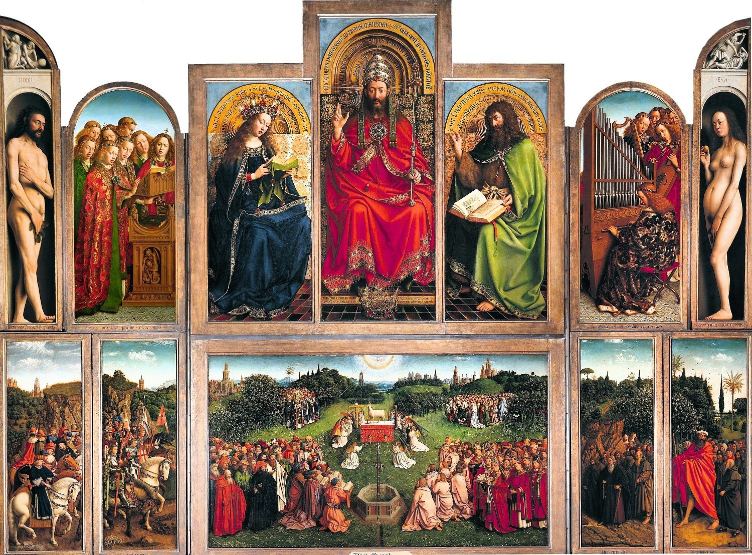###В 1432 году создан и освящен Гентский алтарь: согласно надписи на нем, работа была начата «величайшим из всех» художником Хубертом ван Эйком, а закончена «вторым в искусстве» — его младшим братом Яном ван Эйком. Здесь изображены Адам и Ева, хоры ангелов, поклонение агнцу из Откровения Иоанна Богослова, а на внешних створках можно увидеть коленопреклоненные фигуры Йоса Вейдта, заказчика алтаря, и его жены Лисбет Борлют. Достоверно изображенные человеческие фигуры производят особенное впечатление на зрителей. Алтарь быстро становится одним из самых известных ренессансных произведений: уже к концу XV века посетители платят за возможность на него посмотреть, а гуманист Иероним Мюнцер говорит: «Ван Эйк объял всю существующую доныне историю живописи». [Записки о Средневековье](https://t.me/medievalnotes)