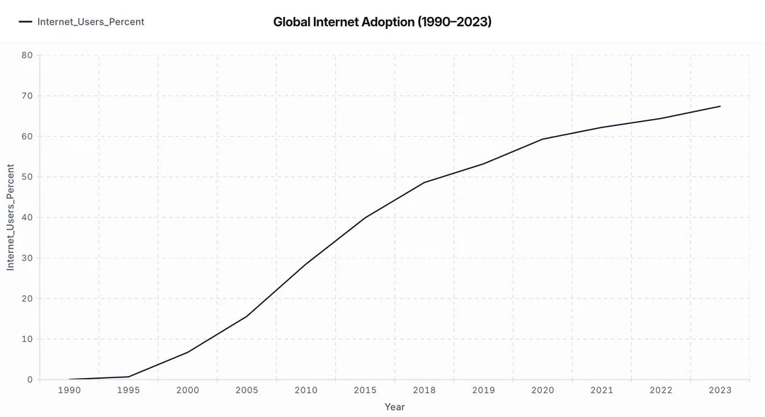 ###🌐**От единиц до 5,4 миллиарда: история интернета в одном графике** Пользователь под ником **Still-Alternative-64** опубликовал на Reddit визуализацию, которая хорошо передаёт масштаб этого сдвига. В 1990-м интернет был уделом буквально единиц. Исследователи, военные, горстка университетов. Прошло три десятилетия — и сегодня сеть охватывает **67,4% жителей Земли**. Это 5,4 миллиарда человек. Интересно смотреть на кривую роста. Первое по-настоящему крутое ускорение — середина 1990-х, когда появились браузеры и веб стал «народным». К 2000 году онлайн вышли около 6% населения — примерно 361 миллион человек. Казалось бы, немного... но это был уже целый новый мир. **Самый взрывной период — примерно с 2005 по 2018 год.** Смартфоны сделали своё дело: интернет перестал требовать компьютера, проводов и технических знаний. Достаточно было просто купить телефон. Именно тогда кривая на графике идёт почти вертикально. После 2018-го рост заметно замедлился. И это логично — «лёгкая» аудитория уже подключена. Те, кто ещё офлайн — это, как правило, жители беднейших стран или труднодоступных районов. В высокодоходных государствах в сети сидят 93% населения. А вот в странах с низким доходом — лишь 27%. Разрыв в 66 процентных пунктов. Впечатляет! За пределами сети остаются **2,6 миллиарда человек**. Треть человечества, если считать грубо. Для них интернет — не данность, а всё ещё привилегия. Мы провели фактчек этого графика — данные сходятся. Первоисточник графика: [база](https://www.itu.int/itu-d/reports/statistics/2023/10/10/ff23-internet-use/) World Bank World Development Indicators. @droidergram
