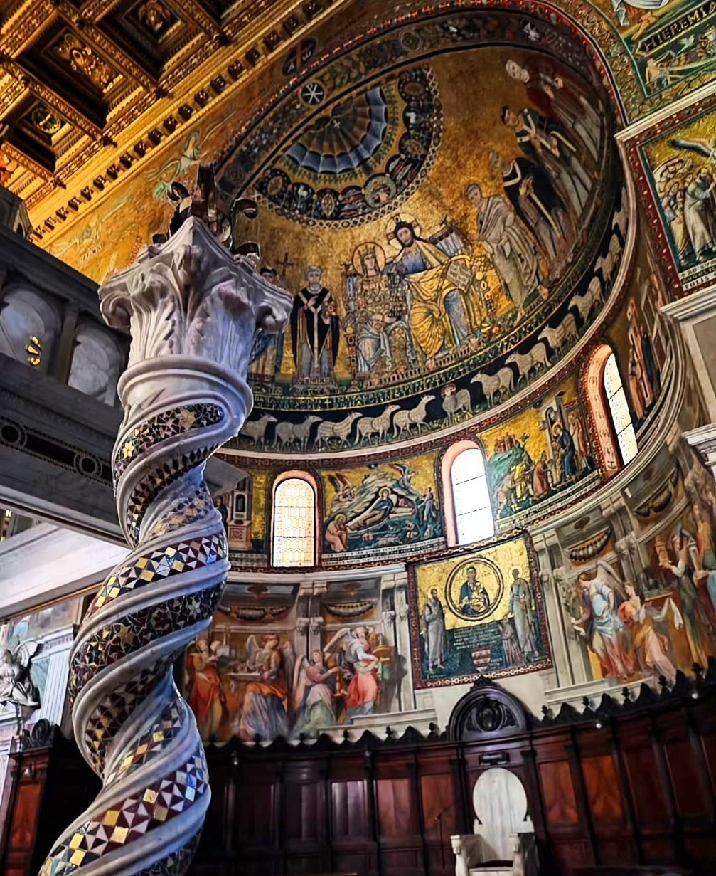 ###Мозаики в Санта-Мария-ин-Трастевере, Рим. Церковь была почти полностью перестроена папой Иннокентием II в XII веке, главным образом с использованием травертина и мрамора, привезённых из терм Каракаллы. Драгоценная мозаика XII века, изображающая Деву Марию и Христа, восседающих на одном троне, украшена в нижней части сценами из жизни Богородицы, также выполненными в мозаике, — работой Пьетро Каваллини (1291). [Записки о Средневековье](https://t.me/medievalnotes)