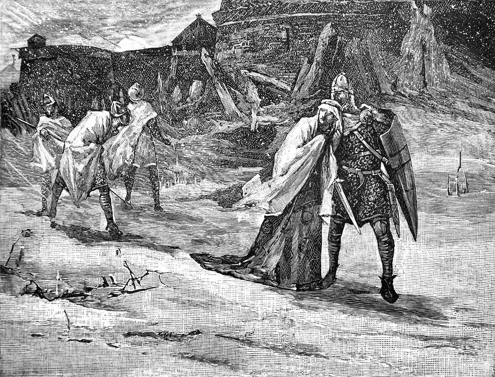 ###На этой иллюстрации изображён побег королевы Матильды из Оксфордского замка. Матильду дважды брали в плен, но легенда рассказывает о её изобретательных планах побега. Во время осады Оксфорда она сумела выбраться из своей тюремной камеры в башне и пешком пересекла замёрзшую реку. Она надела белый плащ, чтобы слиться со снегом. В другой раз, когда её держали в заключении в Уилтшире, она, по преданию, притворилась мёртвой спряталась в погребальном костре, пока её не спас сводный брат. [Записки о Средневековье](https://t.me/medievalnotes)